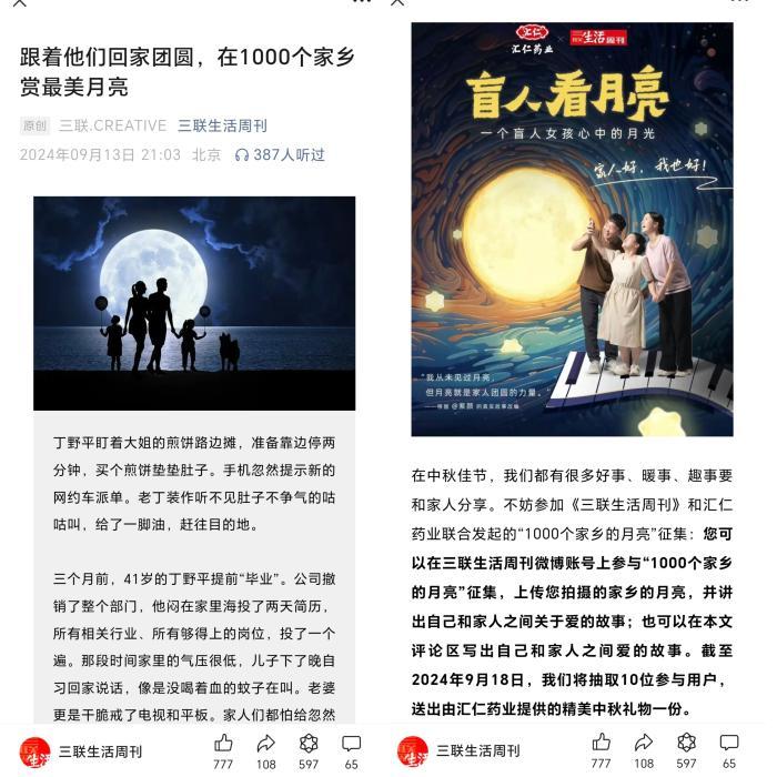 月亮就是家人的力量,无论在哪都能把我们照亮。为鼓励用户和家人共度佳节、“补圆”中秋,汇仁还携手三联生活周刊共同发起了“一千个家乡的月亮”征集活动,极大激发了大众的参与热情。