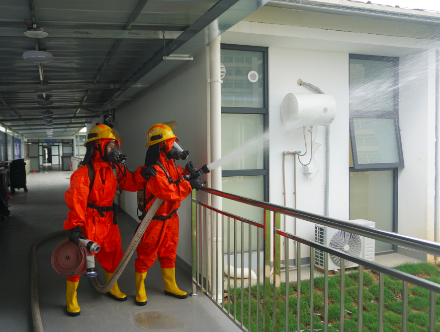 “现在健康驿站一楼有人被困,救援开始!”为了检测健康驿站的火灾防范水平及救援能力,该大队在健康驿站重点区域预设火点开展灭火救援演练。